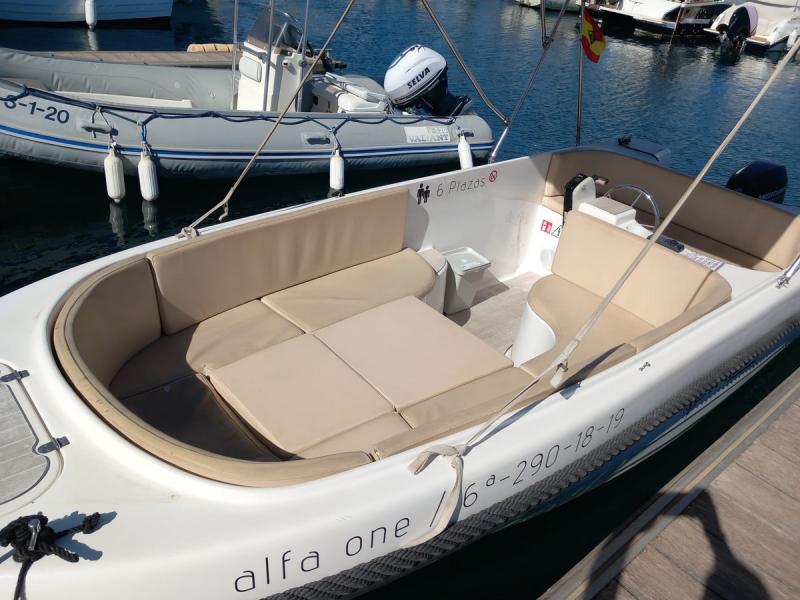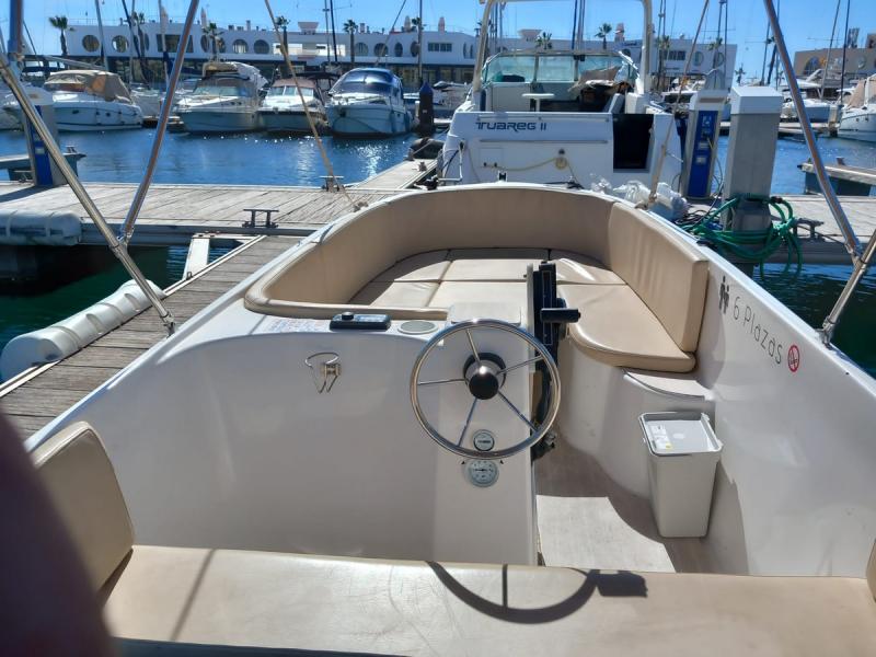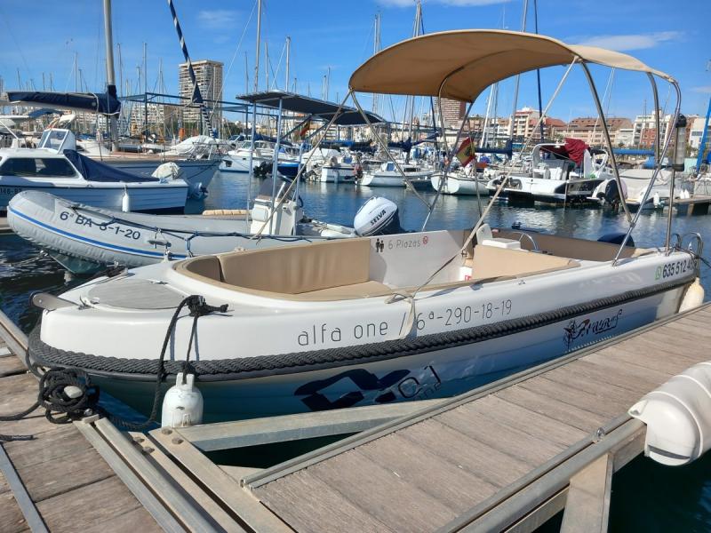 Barco de 5 metros de eslora y 2 metros de manga. Cuenta con un toldo para protegerse del sol, una escalera de baño para facilitar el acceso al agua, capacidad para hasta 6 personas, equipo de sonido bluetooth para disfrutar de tu música favorita, nevera portátil para mantener tus bebidas y alimentos frescos y una sonda para conocer la profundidad del mar. Perfecto para aquellos que buscan hacer snorkel, iniciarse en la navegación o simplemente disfrutar de un día relajado en el mar. ¡Y lo mejor de todo es que no requiere titulación para ser usada!